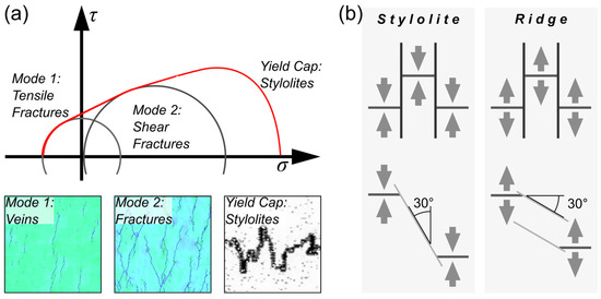 (a) Mohr–Coulomb circle. Mode 1 (tensile fractures) covers tectonic features like veins, Mode 2 (shear fractures) results in fractures, while stylolites are the result of stress beyond the Yield Cap. (b) Stress directions (arrows) in stylolites and MOR environment force their tectonic features to stress equilibria.