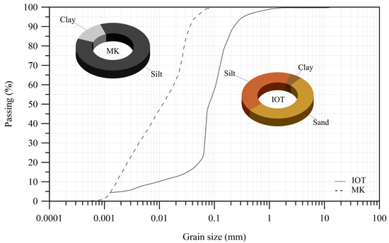 Materials characterization (Figure 1 and Figure 2 and Table 1 and Table 2) was verified by determining the specific weight of grains (ASTM D854 [35]), Atterberg limits (ASTM D4318 [36]), and grain size distribution (ASTM D7928 [37]) for both IOT and MK. In addition, materials were also chemically and mineralogically characterized through X-ray fluorescence spectrometry (XRF) and X-ray diffraction (XRD) tests. XRF analysis was performed by means of quantitative analysis with a calibration curve based on tabulated rock patterns from Geostandards. The samples were prepared using the pressed tablet method: 9 g of powdered sample material was mixed with 1 g of Panalytical Wax additive and then pressed using a Fluxana manual press at 25 tons. The presence of volatiles was assessed using gravimetric techniques. The X-ray fluorescence spectrometer is an S2 Ranger (BRUKER), equipped with an Rh X-ray tube. XRD analysis was performed on a D2 Phaser X-ray diffractometer (BRUKER), model D-5000 (θ–2θ), equipped with a fixed Cu anode tube (λ = 1.54184 Å) and operating at 30 kV and 10 mA in the primary beam and curved graphite monochromator in the secondary beam, under the following conditions: 3.0020–70.0030 2theta range, 0.0200° step size, and 0.5s scan time.