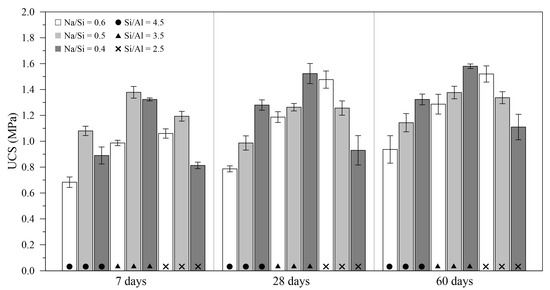 Figure 3 presents the results for the UCS of the cemented tailings over the variation in the three controllable factors (Si/Al ratio, Na/Si ratio, and curing period). At 7 days of curing, the cemented material with 3.5 Si/Al and 0.5 Na/Si ratios reached 1.38 MPa; however, at 28 and 60 days, the highest strengths (1.52 and 1.58 MPa, respectively) were observed in the IOT cement with 3.5 Si/Al and 0.4 Na/Si ratios. In general, the IOT cement mixtures showed a tendency for strength gain at intermediate Si/Al and lower Na/Si ratios. Additionally, strength development occurred significantly over the 28 days, with a smaller increase from that period up to 60 days.