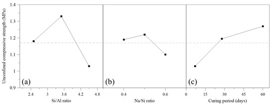 Main effect plots obtained during three-factor full factorial design study for unconfined compressive strength of IOT cement mixtures: (a) Si/Al ratio; (b) Na/Si ratio; and (c) curing period.