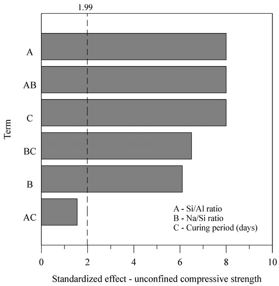 Pareto chart obtained during three-factor full factorial design study for unconfined compressive strength of IOT cement mixtures.
