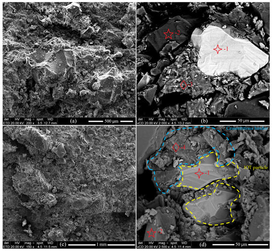 SEM images of the IOT cement mixture at different curing stages and magnifications: (a) 7-day curing period, 200× magnification; (b) 7-day curing period, 2000× magnification; (c) 60-day curing period, 150× magnification; and (d) 60-day curing period, 2500× magnification. The red symbols (Spectra 1, 2, 3, and 4) correspond to the points analyzed by EDS. In (d), the yellow dashed lines outline iron ore tailings (IOTs) particles, and the blue dashed lines indicate the surrounding cementitious binder.