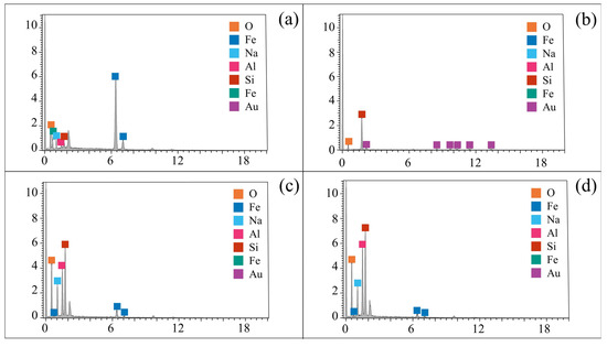 SEM-EDS chemical mapping of the IOT cement mixture: (a) Spectrum 1; (b) Spectrum 2; (c) Spectrum 3; and (d) Spectrum 4. The presence of Au in the spectra is due to the gold coating used for sample preparation and is not part of the actual sample composition.