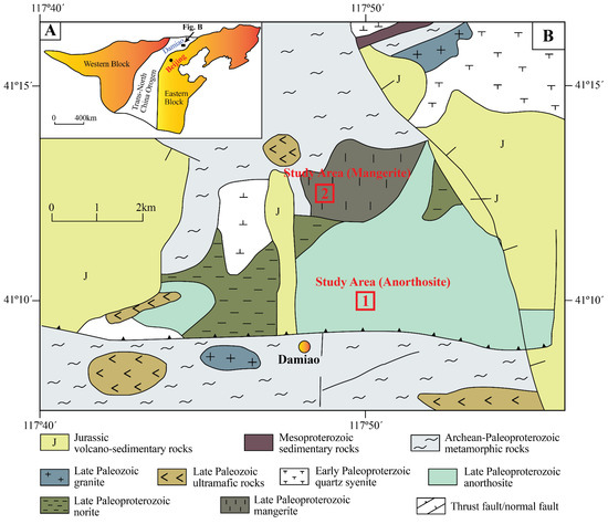 Damiao anorthosite complex: (A) regional location in North China Craton (after [51]); (B) geological map (after [49]).