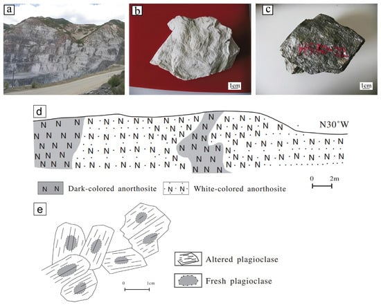 Damiao anorthosite complex: (a) Heishan open pit showing anorthosite and iron ore zones; (b) white anorthosite specimen; (c) dark anorthosite specimen [35]; (d) white and dark anorthosite relationship; (e) sketch of altered vs. fresh plagioclase (after [52]).