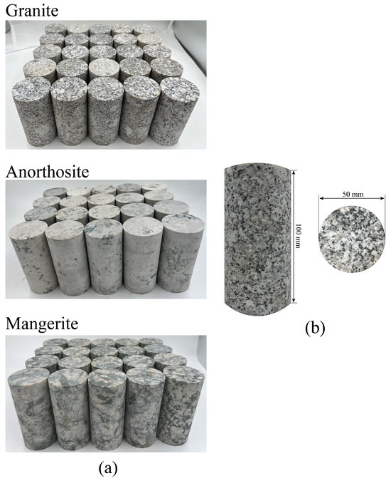 The samples of homogeneous granite, anorthosite, and mangerite, with very limited natural fracturing, were chosen in Maerkang County, Sichuan Province and Chengde County, Hebei Province in China, respectively. The selection criteria focused on intact rock masses with uniform textures and no visible discontinuities to provide representative results of mechanical testing. The specimens were obtained in standard cylindrical form using the specimen preparation guidelines proposed by the International Society for Rock Mechanics (ISRM) [53] by carrying out coring, cutting, and accurate grinding techniques to obtain the specimens. All specimens were manufactured to a nominal diameter of 50 mm and to a height-to-diameter ratio of 2:1 in accordance with standard testing guidelines. A lot of care was taken to achieve geometrical accuracy during the preparation work, and the non-parallelism and non-perpendicularity of the end faces of the specimen have been kept within strict tolerance below 0.02 mm, as shown in Figure 4.