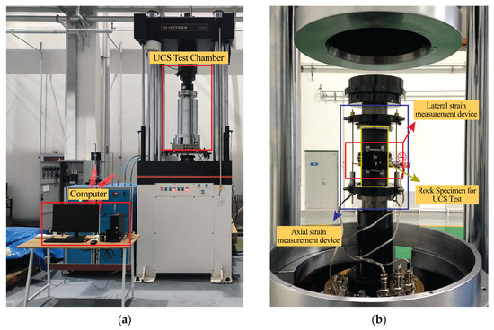 The granitic and mafic rocks were geotechnically analyzed using an in-depth analysis of physical and mechanical characteristics. The basic rock properties were characterized by determining physical properties such as the water absorption, apparent porosity, and bulk density of the rock according to the standard procedures. To determine how rock composition and structure affect mechanical behavior, uniaxial compression testing was employed to examine mechanical properties, specifically compressive strength. The experimental program was conducted using an Instron 8800 Hydraulic Servo Fatigue Testing Machine (Instron, Norwood, MA, USA), as indicated in Figure 5. The technical facilities of this apparatus include advanced capabilities, such as a high-stiffness servo-controlled loading frame, adaptive coordinated feedback control, and accurate measurement systems, which enable the recording of the process of fracture development and deformation [54]. The high structural stiffness is key to ensuring that the full three-dimensional stress–strain response of brittle rock specimens is measured, especially in post-peak behavior when specimens lose their load-bearing capacity and undergo stress drops. The solid loading frame limits the deformation of the apparatus during the test, thereby limiting the amount of energy applied externally and maintaining data integrity throughout the experiment. The uniaxial tests were conducted using a specific procedure, depending on the capabilities of the testing equipment. The diameter and height of each cylindrical specimen were measured and recorded before testing. A 12.5 cm heat-shrinkable tube was sealed to the specimen to preserve moisture content and field conditions until testing, and both axial and circumferential extensometers were used to measure deformation. The metrological parameters of the measurement system were as follows: load cell with a measurement range of 0–500 kN, measurement resolution of 0.01 kN, and measurement uncertainty of ±0.5% of full scale; axial extensometers with a measurement range of ±6.25 mm, measurement resolution of 0.001 mm, and measurement uncertainty of ±0.1% of reading; and circumferential extensometers with a measurement range of ±6.25 mm and measurement resolution of 0.001 mm; measurement linear variable differential transformers (LVDTs), compressometers, and electrical resistance strain gauges were employed to make accurate measurements, and the sensor ranges were regulated to −6.25 mm to 6.25 mm and initial readings to around −4 mm. The tests were conducted under controlled environmental conditions at room temperature (20 ± 2 °C) and relative humidity of 50 ± 5%. All specimens were tested under the same environmental conditions to ensure consistency in the testing conditions and minimize the impact of environmental factors on mechanical properties. The prepared sample was then inserted in the instrument. A small pre-load of 1 kN was applied under force control to ensure that firm seating and appropriate contact were made between the loading platens and the specimen. Once the pre-load was reached, the system was converted to displacement control, and a constant rate of axial displacement of 0.06 mm/min was imposed until the specimen failed. In the process, the axial load, axial deformation, and circumferential deformation were continuously monitored to obtain the compressive strength of the rock and complete stress–strain curve.