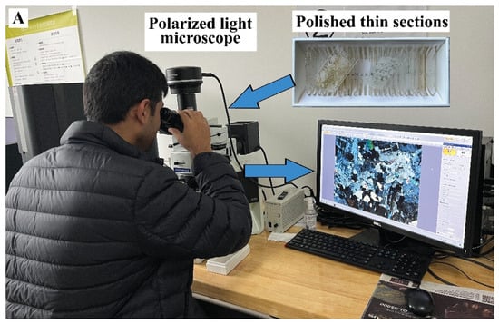 Analytical equipment: (A) polarized light microscope for petrographic analysis; (B) SEM-EDS system for mineralogical and elemental analysis.