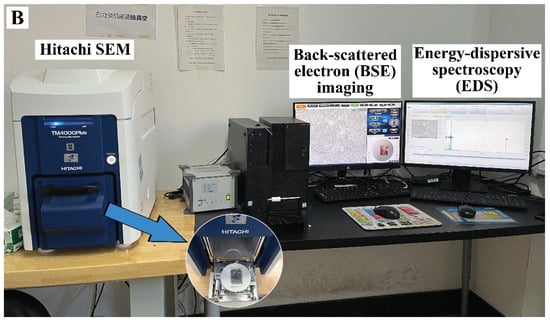The mineralogical and elemental analysis was carried out with a TM4000plus Scanning Electron Microscopy unit (Hitachi, Tokyo, Japan) fitted with Bruker Quantax 75 Energy-Dispersive X-ray Spectroscopy (EDS) at the Institute of Geology and Geophysics, Chinese Academy of Sciences (IGGCAS), as seen in Figure 6B. Back-scattered electron (BSE) imaging, performed at an accelerating voltage of 20 kV, was used to demonstrate the textural characteristics and compositional differences between quartz and feldspar minerals, with each image taking approximately one minute to acquire. At 20 kV, semi-quantitative spot analyses were carried out to determine elemental composition and validate mineral identifications. Single spot analysis took about 15 s, and the area of the spectrum was more than 2.5 × 105 counts for analytical accuracy.