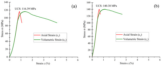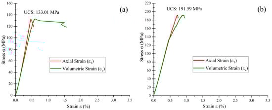 The Shuangjiangkou granite specimens are examples of natural variability in crystalline rocks, with UCS values ranging from 116.39 MPa to 140.38 MPa (Figure 7). The differences in this variation are due to the individual microscopic and mesoscopic mineral, micro-discontinuity, and fabric orientations in each specimen. Mechanical anisotropy is introduced by the oriented distribution of minerals, especially phyllosilicates like mica, which leads to a variation in strength as a result of mineral fabric orientation to the direction of stress. This anisotropy, together with the intrinsic heterogeneity of the rock materials, leads to the differences in the observed mechanical behavior under similar loading conditions and the importance of the petrographic character in governing the mechanical response of rocks.