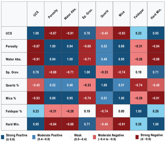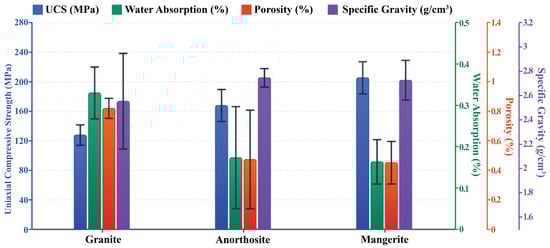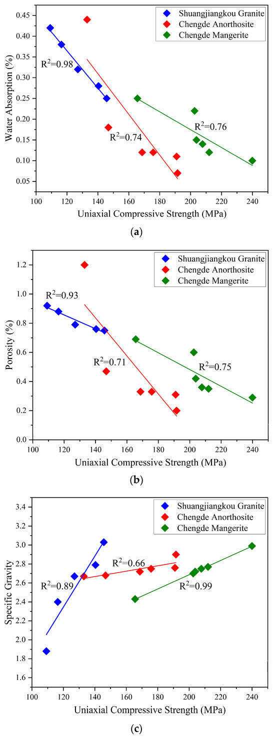 Table 1 presents the strength and physical characteristics of the samples studied, revealing significant correlations between mechanical behavior and petrophysical properties. The physical properties (water absorption, porosity, specific gravity) are directly linked with void spaces and micro-fissures in the rock fabric [15,62]. The data from Shuangjiangkou granite show that the uniaxial compressive strength decreases with an increase in water absorption and apparent porosity (Figure 10). High water absorption means it has a greater ability to absorb water influx, and this increases the rate of weathering, causing a loss of strength. High porosity leads to low cohesion between mineral grains, resulting in low resistance to compressive stress. The positive correlation between specific gravity and UCS is also corroborated by the principles relating higher bulk density to decreased water absorption and porosity, thereby increasing compactness and strength. Bulk density is associated with mineralogical content, and it is inversely correlated with minerals such as albite and positively correlated with quartz and orthoclase [62].