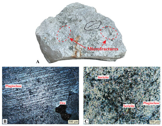 The anorthosite rock samples investigated from North China Craton are creamy white in hand specimen, brittle, with a network of fine microfractures (Figure 13A). Generally, the rock is medium- to coarse-grained and mainly consists of plagioclase phenocrysts, which comprise over 90% of the modal content (Figure 13B,D,F,G). The main mafic mineral is orthopyroxene (5%), with magnetite, ilmenite, and apatite (2%) as the accessory minerals. The plagioclase is altered; however, the typical polysynthetic twinning is retained. Figure 13B shows a high degree of fracturing of the plagioclase crystals around ore minerals forming inter-connective networks, which probably enhances higher water absorption and porosity of weaker specimens. The alteration minerals are clinozoisite and sericite (Figure 13C), which develop along the cleavage planes and grain boundaries. This phyllosilicate alteration is significant because sericite has a platy morphology and a perfect basal cleavage, so it forms planes of weakness that weaken the cohesion between plagioclase grains. Some plagioclase crystals show kinks in their twin lamellae, fractured by micro-fissures or granulated at the edges (Figure 13D,F,G), indicating recrystallization during hydrothermal alteration. Figure 13D shows a massive micro-fracturing within plagioclase crystals, and the fractures are preferentially oriented in cleavage planes. The intracrystalline discontinuities become stress concentrators under loading and induce the crack propagation at lower applied stresses than would be needed in the unaltered material.