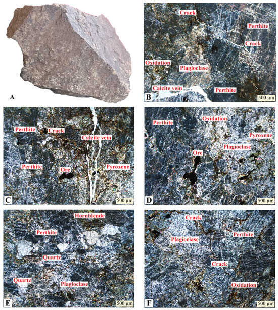 Petrographic analysis of mangerite: (A) rock block; (B) Sample 1Mg1; (C) Sample 1Mg2; (D) Sample 1Mg3; (E) Sample 1Mg4; (F) Sample 1Mg5.