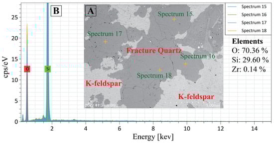 Mineral analysis of granite quartz (1G1a): (A) SEM micrograph; (B) EDS elemental spectrum.