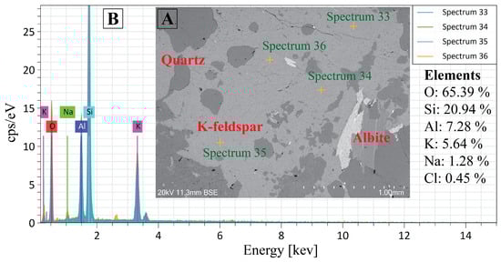 At spectrums 33–36, K-feldspar is a light gray phase with an elemental composition of O: 65.39%, Na: 1.28%, Al: 7.28%, Si: 20.94%, Cl: 0.45%, and K: 5.64%, as shown in Figure 16, which highlights the BSE contrast between K-feldspar and surrounding minerals. The presence of 1.28% Na indicates there were cryptoperthitic intergrowths by exsolution in the cooling process, producing internal planes of weakness to facilitate fracture growth [66]. The aberrant content of Cl (0.45%) points to the hydrothermal alteration at temperatures above 400 °C that adds to the hydrolytic weakening along the cleavage planes and contributes to the observed variability of the UCS (109.17–145.68 MPa) [67]. BSE imaging indicates quartz grain fracturing and intergranular merging with feldspar, probably caused by high-pressure, high-temperature metamorphism. These contacts foster local weakening. The feldspar and quartz have different thermal expansion, which creates boundary stresses of 20–50 MPa to promote crack initiation. Moreover, medium Na-K feldspar weakens granite by ~15% relative to K-feldspar endmembers, and every 10% increment in the content of feldspar can lower UCS by 15–25 MPa due to increased cleavage development.