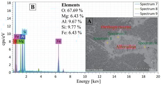 Further analysis of BSE in Figure 18 revealed deformed orthopyroxene grains with an elemental composition of O: 67.69%, Mg: 6.43%, Al: 9.67%, Si: 9.77%, and Fe: 6.43%. The decreased BSE contrast reveals pseudomorphic replacement resulting from hydrous alteration. Fresh orthopyroxene normally increases both the strength and the cohesiveness of mafic rocks; however, when altered, it loses more strength and becomes less cohesive phases with reduced elastic moduli. These deformations induce mechanical heterogeneity in the rock, which lowers the strength of the rock. Fractures are likely to originate and extend within these modified areas during loading, and as such, an increase in uniaxial compressive strength variability has been observed between anorthosite specimens.