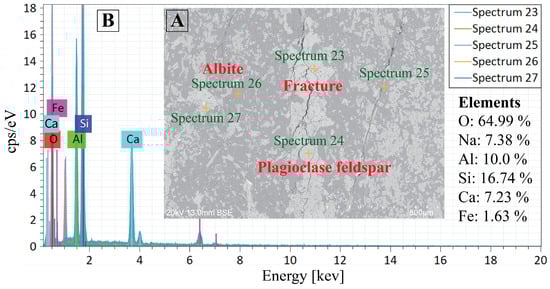 Back-scattered electron (BSE) imaging showed important mineralogical features that determine the mechanical behavior of anorthosite. Figure 17 shows the presence of albite (NaAlSi3O8) in existing fractures, with EDS analysis showing an elemental composition of O: 63.93%, Na: 6.51%, Al: 8.55%, Si: 20.63%, and Ca: 0.58%. Mechanical anisotropy is also induced by the presence of albite in the fractures, which has perfect [001] cleavage and a lower hardness as compared to the surrounding plagioclase matrix. These albite-filled planes are directions of preferential failure of rock subjected to uniaxial loading and decrease the overall strength of the rock fabric. This mineralogical heterogeneity is a major source of variation in UCS, with variations exceeding 58 MPa among samples of similar composition, which emphasizes the importance of the distribution of minerals in the microstructure in determining the strength properties of anorthosites.