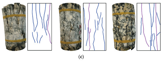 Visual analysis reveals distinct quantitative variations in crack density resulting from petrographic differences. Granite samples formed 1–3 major shear cracks as a result of gradual failure along mica-rich weaker planes, anorthosite samples had 4–8 primary tensile cracks induced by the mica alteration effect, and mangerite samples had 6–12 tensile cracks formed by rapid crack propagation through the strong mineral network after the elastic limit was surpassed.