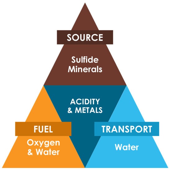 Sulfides present in sulfidic tailings, when exposed to an oxidant such as atmospheric oxygen, can release metals that are toxic in certain quantities to the receiving environment. While other toxic constituents may be released, the reaction of sulfide minerals such as pyrite and pyrrhotite with oxygen and water also results in the release H+ ions, decreasing pH, which may result in dissolution of other minerals present that were otherwise stable under more neutral pH conditions in a process referred to as ARD (or as acid and metalliferous drainage (AMD) in Australia) [24]. However, even if the pH remains neutral (buffered by carbonate minerals or silicates with sufficiently fast weathering rates), neutral mine drainage (NMD) may occur and result in elements in toxic quantities released into the environment (e.g., [25,26,27,28]). Generation of acidity and metals from sulfide oxidation, which is the key mechanism for generation of ARD in tailings, requires three key “ingredients” which can be conceptualized in a modified fire triangle (Figure 2). These include (1) a “source” of metals, (i.e., typically sulfide minerals containing elements of concern) within the sulfidic tailings; (2) “fuel” or an oxidant for sulfide oxidation reactions (i.e., molecular oxygen or ferric iron; in the case of tailings, oxygen transport into the tailings mass primarily as a result of diffusion from surficial exposed tailings material) as well as water (which may be limited under very dry climate and storage conditions); and (3) a mechanism to “transport” metals out of the TSF (i.e., water flow through advection). Without these ingredients, metals and metals may not be released into the receiving environment.