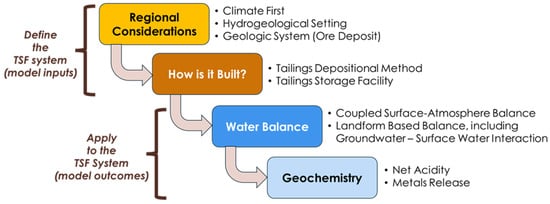 Broadly, the conceptual model tool inputs are first determined by defining the TSF system (i.e., regional considerations and how/where the TSF is constructed) (Figure 1). Regional considerations include climate, hydrogeologic conditions, and geologic systems; conditions inherent to the location of the mine that cannot be engineered. The “how is it built” category considers tailings deposition and TSF construction method(s); these are engineering design choices that are selected by the mine and influenced by regional considerations. Inputs are then used to evaluate model outcomes for water balance and geochemistry. Water balance calculations will include Operations versus Closure water balance, groundwater and surface water interaction (i.e., recoverable-unrecoverable seepage ratio(s), coupled surface-atmosphere water balance(s), and landform-based water balance(s). The resulting geochemistry, controlled by risk of ML/ARD, oxidation depth, and exposed surface area, is binned in terms of metal release from the TSF, considering flow pathways defined by the TSF design and water balance.