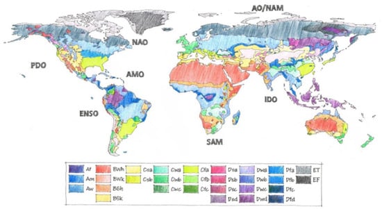 33. Peel, M.C.; Finlayson, B.L.; McMahon, T.A. Updated world map of the Köppen Geiger climate classification. Hydrol. Earth Syst. Sci. Discuss. 2007, 11, 1633–1644. [Google Scholar] [CrossRef]