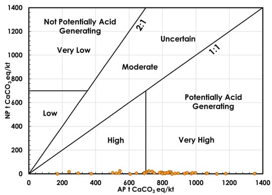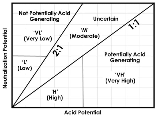 A commonly used guidance document by Price [42] outlines the process of quantifying sulfide minerals to neutralizing minerals through Acid Base Accounting (ABA), where the acid generation potential (AP) (calculated from sulfide mineral abundance, which release H+) is compared to the neutralization potential (NP) (calculated from buffering mineral abundance, which consume H+). In the conceptual model tool, to evaluate the effects of geologic system, AP and NP should be calculated and plotted using Figure 5, where samples classified as Potentially Acid Generating (PAG) mine materials contain insufficient buffering minerals to neutralize acidity, and Non-Potentially Acid Generating (NPAG) mine materials contain sufficient buffering minerals to neutralize acidity [42]. As a default, it is recommended to use total sulfur (S) to calculate AP (rather than sulfide content) (Equation (1)) and total carbon (C) to calculate NP (Equation (2)) [42], as total S provides some conservatism for sulfide estimation, while C may be more easily obtained in the exploration period than Sobek or modified Sobek analyses. However, minerals such as gypsum, barite, anhydrite, or other SO4-bearing salts that do not contribute to acidity, or graphite, coal, siderite, rhodochrosite, or other C sources that do not contribute to neutralization, may create errors in AP and NP calculations [42]. For this reason, mineralogy data is important to interpret results on a site-specific basis and should be coupled with interpretations. Given more detailed geochemical characterization, these measurements may be updated to site-specific measurements of AP and NP (including correction factors that consider mineralogy and/or kinetics) at a later stage.