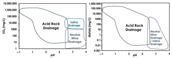 The resulting binning categories ‘VL’ to ‘VH’ with respect to AP and NP are shown in Figure 5. Scale has purposely not been included for AP and NP, because the range and evaluation of ARD risk as ‘VL’ versus ‘L’ will need additional geochemical consideration to evaluate in a project or regional evaluation suitable for the LCI under consideration. Regardless, materials characterized as PAG will require some management strategy to control ML/ARD risk. The benefit of using AP and NP in an acid-base balance as an initial evaluation tool is that it allows for incorporating site-specific data, which is relatively easy to obtain during the exploration process. While mineralogy, elemental abundance, laboratory kinetic testing, and field scale kinetic data are important for characterizing mine materials (and are now often required to attain a permit to operate in many jurisdictions), this binning approach may be applied for sites early in the exploration stage to plan for managing their waste material. By using the resulting acid generation risk classification and binning, the ranges of expected SO4 and metals release based on Ficklin plots are presented by Plumlee et al. [39] and INAP [43] (Figure 6). For example, if a site’s data plots below the 1:1 slope of NP:AP, it is categorized as ‘H’ or ‘VH’, falling in the ARD range of expected metals and SO4 release (Figure 6). The deposit type has been a focus of previous LCIs [5,8] because certain deposit types (e.g., porphyry, volcanogenic massive sulfide, Mississippi-Valley type, etc.) are more likely than some other ore deposit types to contain higher portions of sulfides, low acid neutralization, and therefore result in metal release [39], and due to the accessibility of deposit type for LCA practitioners over more detailed geochemical characterization data. However, given the range of uncertainty inherent to forecasting metal release rates based on deposit type alone, knowing the deposit type alone is unlikely to capture the operational and closure risk. The binning approach using acid-base characteristics shown here allows for more site-specific classification and more accurately demonstrates the variability in potential metal release under ARD conditions where only limited data is available; additional data will be required to acquire greater precision. The tool outlined here encourages application of site-specific data to better capture metal release potential.