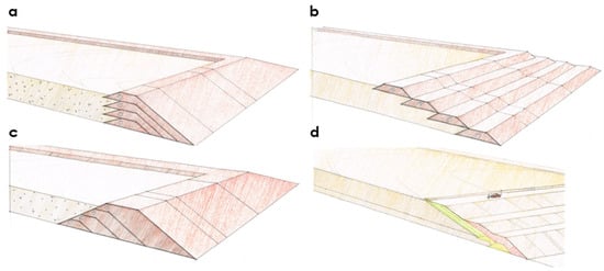 Figure 7a to c shows schematic cross-sections of upstream, centerline, and downstream tailings dam construction methods, while Figure 7d is a schematic cross-section of an upstream construction method, with downstream buttressing to support geotechnical stability. Tailings dam construction method and tailings deposition method are often chosen in combination; hence, the former also influences sedimentation, settlement, and segregation of tailings during deposition, and therefore tailings density and consolidation.