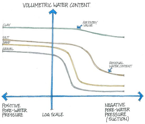 Figure 8. Water retention curves for typical material types (from MEND [47] and after Freeze and Cherry [34]). Illustration by Derrill Shuttleworth.