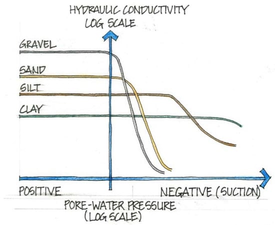 Hydraulic conductivity (which is closely related to the concept of intrinsic permeability) [34] is the material property that characterizes the ability of the material to transmit fluid. Water will move through the material in response to energy gradients; mechanical energy gradients (i.e., total head, which comprises pressure head and elevation head), but also due to thermal, electrical, or chemical gradients. The flow of liquid water in response to mechanical energy is defined by the relationship between a unit flux of water and the energy gradient, and is commonly referred to as Darcy’s Law (Equation (3)):