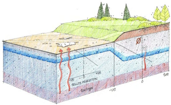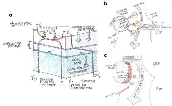 Oxygen can move into and through mine materials by (1) advection and/or (2) diffusion. In tailings material, oxygen ingress is typically limited to that by diffusion due to their smaller grain size and partial saturation of pore space by water limiting advective airflow into TSFs [29]. Mine rock stockpiles have larger grain sizes (ranging from clay size fractions to boulders) [30] and tend to be free-draining, which allows both advective and diffusive flux of oxygen to enter the pile. This advective flux in mine rock stockpiles is partially the reason why such significant acidity and metal is released; the fuel (i.e., oxygen) for the fire (i.e., metal release from sulfide minerals) is more easily transported to greater depths, creating greater volumes of “reactive” material in terms of sulfide oxidation relative to tailings. In short, with conventional mine rock stockpiles, there is typically a nearly unlimited re-supply of oxygen for ongoing sulfide oxidation. In contrast, sulfide oxidation in tailings is self-limiting as it is controlled by the depth of oxidation and the limited flux of air (approximately 21% by volume O2) that can occur from the surface [18,31]. An added complication is that once metals are mobilized from their solid mineral form, they may be attenuated and/or re-mobilized through geochemical processes such as secondary mineral precipitation, sorption, or ion exchange processes. Other minerals reacting within the tailings can release or consume water, which may influence water availability for the sulfide oxidation reaction to proceed under systems in dry climates with water limiting cover placements.