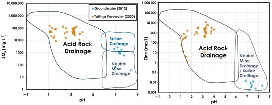 Figure 16. Faro tailings porewater [58] and groundwater concentrations [64] of sulfate and zinc versus pH.