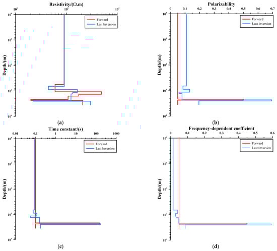 The inversion results for the electrical parameters are generally more accurate than those for the polarization parameters. From the fitting results of each model, although the curve fits well and the algorithm can effectively invert the distribution of the underground medium, some discrepancies between the model parameters and the theoretical model nevertheless remain—most likely attributable to non-uniqueness. Based on the changes observed in the and curves, as well as the mean fitting errors, it can be concluded that the algorithm can accurately find the optimal solution even during the later stages of inversion.