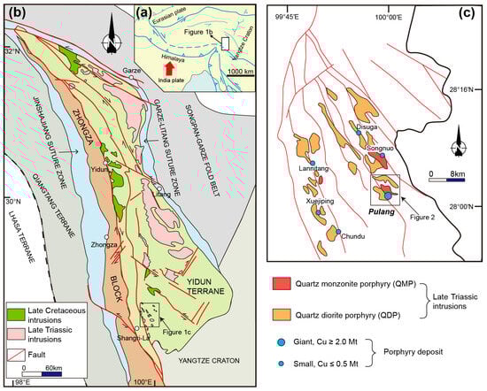 The Pulang porphyry Cu-Au deposit is situated in the southern segment of the Yidun arc, part of the Sanjiang Tethys Orogen in eastern Tibet (Figure 1). The Yidun Terrane is situated between the Songpan-Garze Fold Belt to its west and the Qiangtang Terrane to its east, bounded by the eastern Garze-Litang Suture Zone and the western Jinshajiang Suture Zone and the Yangtze Craton to the southeast (Figure 1a,b). The N-S-trending Fault then cuts the Yidun Terrane into distinct sections, the Zhongza block to the west and the Yidun arc to the east, where the Pulang porphyry Cu-Au deposit is located [27]. The Yidun arc mainly comprises Late Triassic arc-like magmatic rocks (238–210 Ma; [28]) and coeval volcaniclastic rocks, which intrude or conformably overlie Middle–Upper Triassic fine-grained clastic, bioclastic, and mudstone rocks, whereas the Zhongza block mainly consists of deformed or metamorphosed Paleozoic rocks [29].