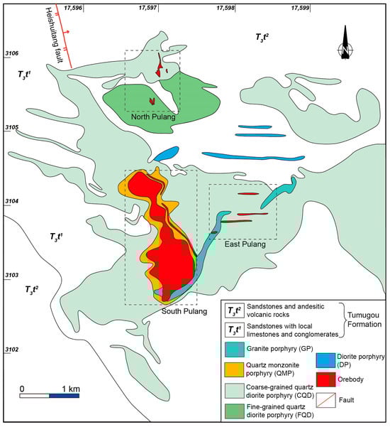 A simplified geological map of the Pulang porphyry Cu-Au deposit, showing major lithology units (modified from [21]).