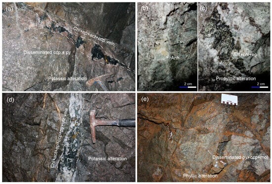 Photographs of hydrothermal alteration at Pulang. (a) Chlorite (Chl), epidote (ep), actinolite (act), and chalcopyrite (ccp) veins in the potassic alteration zone. (b) Anhydrite (Anh) in the potassic alteration zone, associated with K-feldspar and quartz. (c) Actinolite, chlorite, and epidote in the propylitic alteration zone. (d) The propylitic vein minerals include chalcopyrite (ccp), pyrite (py), and quartz (qtz) intruding the potassic alteration zone. (e) Phyllic alteration with disseminated pyrite and minor chalcopyrite and molybdenite.