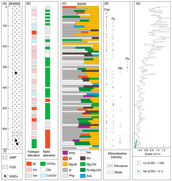 Comprehensive interpretation of ZK0403 at Pulang porphyry Cu-Au deposit. (a) Geological log, (b) alteration intensity, (c) shortwave infrared spectroscopy diagram, (d) mineralized intensity of ZK0403, and (e) Cu-Mo grade diagram of ZK0403. Bt—biotite; Chl—chlorite; Ep—epidote; Kfs—K-feldspar; Qtz—quartz; Ser—sericite; Cal—calcite; Dol—dolomite; Kln—kaolinite; Ilt—illite; Phg—phlogopite; Ank—ankerite.