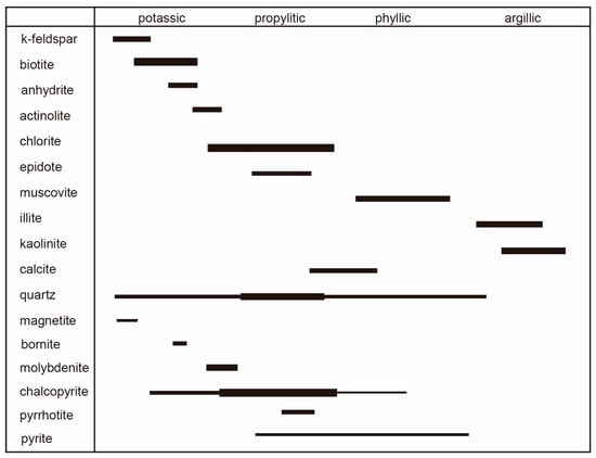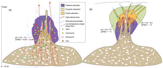 (a,b) Schematic diagram of alteration zones and hydrothermal fluid evolution of Pulang porphyry Cu-Au deposit (modified from [78,79]).