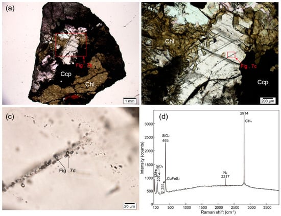 Fluid inclusion assemblages (FIAs) from the propylitic alteration stage were identified through petrographic observations and laser Raman spectroscopy (532 nm). These veins typically exhibit a harbor-like shape, with chlorite and chalcopyrite occurring along the edges or fractures (Figure 7a). Chlorite often forms a curved or worm-like pattern embedded within quartz, while chalcopyrite fills the gaps between chlorite and quartz, creating a harbor-like structure (Figure 7b). The FIAs are predominantly located along healed fractures within chlorite-surrounding quartz, suggesting a close association with the propylitic alteration (Figure 7c). These inclusions are primarily vapor-rich, a feature rarely observed in other alteration stages (Figure 7c). The inclusions are mainly distributed along healed fractures within quartz and chlorite and are spatially associated with chalcopyrite and pyrrhotite. These petrographic characteristics imply that the inclusions were likely trapped during or shortly after mineralization, rather than being purely secondary. Hence, we interpret these FIAs as being closely related to the ore-forming propylitic fluids. The Raman spectroscopy results indicate that most of these vapor-rich FIAs are composed of methane (Figure 7d). This observation, along with the presence of pyrrhotite during the propylitic alteration stage (Figure 4d), suggests a decrease in redox potential during this alteration stage.