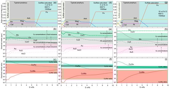 Thermodynamic simulation of S titration model. (a) Control effect of sulfur concentration variations on buffer mineral assemblages at low salinity (NaCl = 1 wt%) and (b) its effect on metal solubility, and (c) comparison with metal content in fluid inclusions of porphyry deposits. (d) Control effect of sulfur concentration variations on buffer mineral assemblages at moderate salinity (NaCl = 5 wt%) and (e) its effect on metal solubility, and (f) comparison with metal content in fluid inclusions of porphyry deposits. (g) Control effect of sulfur concentration variations on buffer mineral assemblages at low salinity (NaCl = 10 wt%) and (h) its effect on metal solubility, and (i) comparison with metal content in fluid inclusions of porphyry deposits.