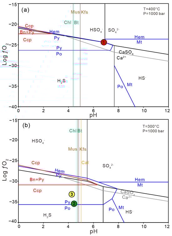 pH-logƒO2 phase diagram of alteration minerals at (a) 400 °C and (b) 300 °C. The mineral equilibrium interaction lines are mainly calculated according to the log K values in Supplementary Table S4. Circle 1 represents the pH and logƒO2 values defined by the mineral assemblages of potassic alteration, and Circles 2 and 3 represent propylitic alteration and phyllic alteration, respectively.