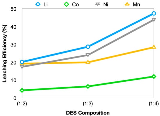 To investigate the effect of the amount of carboxylic groups on the leaching efficiency, three different Na-DES with different mole ratios were prepared. ChCl and GLY solutions were prepared at a molar ratio of 1:2, 1:3, and 1:4, and leaching experiments were carried out at a solid-liquid ratio of 10 g/L for 1 h at 60 °C. Leaching efficiencies obtained for the three different Na-DES are presented in Figure 2. Increasing the GLY molar ratio from 2 to 4 resulted in an enhancement of leaching efficiency, with increases observed from 20.24% to 47.47%, from 4.31% to 12.07%, from 17.50% to 43.92%, and from 19.28% to 28.48%, respectively, for Li, Co, Ni, and Mn. Lu et al. (2022) reported that the leaching efficiency of Malonic acid (MA) (containing a carboxyl group) with ChCl was higher than EG: ChCl and EG: urea [35]. DESs containing carboxyl groups provide higher leaching efficiency than other DESs due to the large number of free protons and the strong coordination ability between the carboxylate and metals [36]. Consequently, the increase in the GLY molar ratio exhibited a significant effect on the leaching efficiency.