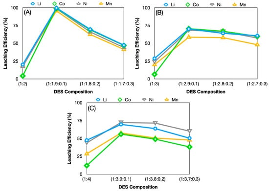 The leaching efficiency could not be increased above 48% for four metals by the use of ChCl and GLY. Leaching studies with DESs prepared with oxalic acid (OxA) or MA (containing a carboxyl group): ChCl have been conducted in the literature, and leaching efficiencies are high [35,37]. Among the three acids (oxalic, malonic, and glycolic), oxalic acid demonstrates the highest degree of acidity due to its pronounced resonance and inductive effects. MA exhibits weaker interactions due to the presence of a leaving methylene group. GLY demonstrates the least acidic properties due to the absence of multiple carboxylic groups and the reliance on weaker inductive effects from its hydroxyl group. Nevertheless, the viscosity order of the DESs prepared separately with these three acids and ChCl is as follows: ChCl:GLY < ChCl: MA < ChCl:OxA [38]. The high viscosity values of DES pose a significant challenge in the utilization of these solvents in industrial recycling processes [39]. Therefore, the leaching efficiency of the mixture of GLY (containing a carboxyl group) and ChCl was tried to be increased by adding a third organic substance in DES. AA was added to the system to maintain the ChCl:acid ratio due to its reducing and solvent properties. As seen in Figure 3A, the addition of AA into the ChCl:GLY system significantly improved the leaching efficiencies of Li, Co, Ni, and Mn. In the reaction where 1:2 ChCl:GLY DES solution was used, 20.24%, 4.31%, 17.50%, and 19.28% leaching efficiency was obtained for Li, Co, Ni, and Mn, respectively. Moreover, in the reaction where 1:1.9:0.1 ChCl:GLY:AA was used, 99.68%, 98.95%, 98.58%, and 95.56% leaching efficiency was obtained for Li, Co, Ni, and Mn, respectively. However, increasing the amount of AA (1:1.8:0.2 and 1:1.7:0.3 ChCl:Gly:AA) caused a significant decrease in leaching efficiency. In their study, Liu et al. (2018) reported that an increase in the amount of AA in the ChCl:AA DES solution increased solution viscosity [40]. Additionally, Kaur et al. (2018) reported in their study that increasing the GLY ratio in the ChCl:GLY system decreased the viscosity [23]. It is thought that the decrease in the amount of GLY and the increase in the amount of AA in the ternary DES system increased viscosity. It has been demonstrated that elevated viscosity leads to increased solvent flow, as well as greater resistance to heat and mass transfer [41]. Consequently, this results in a reduction in leaching efficiency.