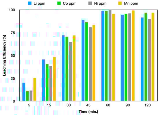 The time-dependent leaching efficiency of the leaching reaction (60 °C, and 10 g/L) using the 1:1.9:0.1 ChCl:GLY:AA ternary DES system is given in Figure 4. It was determined that the leaching reaction achieved maximum efficiency at the 60th minute. The leaching of cathode powders utilizing binary DES, composed of an HBD and an HBA species, typically requires tens of hours or even days [42]. In the ternary system where GLY contains a carboxyl group, which has a high reducing capacity, such as AA, was used, complete dissolution of the cathode powder in the black mass was achieved in 60 min. Furthermore, in this study, black mass containing pure cathode powder was not utilized; however, the leaching process of cathode powders containing ~40% graphite by weight and exhibiting varying chemical compositions was conducted. Although the presence of graphite may reduce the leaching efficiency because it creates a physical barrier, a leaching efficiency of over 95% was achieved for all metals in 60 min.