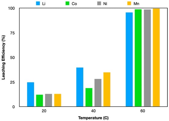 Temperature is a crucial parameter in leaching processes involving DES. Due to the high viscosity of DES, higher temperatures are required compared to leaching reactions using inorganic acids [43]. Moreover, the viscosity of DES can be reduced either by adding water to the solution or by increasing the temperature; however, adding water may decrease leaching efficiency, as it can weaken the hydrogen bonding network within the DES [17]. In literature studies, ChCl–GLY DESs have been reported to decrease viscosities by 20-fold as the temperature increases from 20 °C to 80 °C [12]. Therefore, in this study, instead of adding water to DES, the effect of temperature on leaching efficiency was investigated. Additionally, the potential esterification of carboxyl groups in DES with the HBD must be considered when determining the operating temperature range [38]. Esterification reactions for DESs that use carboxylic acids as HBD and ChCl as HBA occur at temperatures above 60 °C [39,44]. Rodriguez et al. (2019) reported that esterification of 1%, 5%, and 9% (molar ratio) occurred in the system with the preparation of 1:2 ChCl:GLY at 60 °C, 80 °C, and 100 °C, respectively [45]. Due to these considerations, the leaching experiments in this study were limited to a temperature range between 20 °C and 60 °C, with no experiments conducted above 60 °C. The dependency of leaching efficiency on temperature is illustrated in Figure 5 (1:1.9:0.1 ChChl:GLY:AA, 60 min, and 10 g/L). Increasing the temperature from 20 °C to 60 °C caused an increase in leaching efficiencies from 24.63% to 95.56%, from 12.11% to 98.35%, from 12.9% to 98.59%, and from 12.95% to 99.68% for Li, Co, Ni, and Mn, respectively.