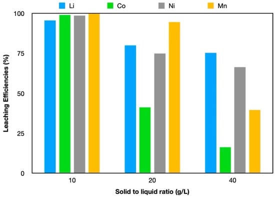 The effect of the solid-to-liquid ratio on leaching efficiency was investigated. The effect of 10–40 g/L solid-to-liquid ratio on leaching efficiency is given in Figure 6 (1:1.9:0.1 ChCl:GLY:AA, 60 min, 60 °C). Increasing the solid-to-liquid ratio from 10 g/L to 40 g/L resulted in a decrease in metal leaching efficiency from above 98% to 75.27%, 16.26%, 66.35%, and 39.06% for Li, Co, Ni, and Mn, respectively. At a certain solid-liquid ratio, the solution becomes saturated, and the amount of insoluble particles increases [46]. The optimum solid-liquid ratio was therefore maintained at 10 g/L.
