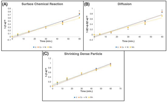 Leaching efficiencies’ compatibility with surface chemical reaction (A), diffusion control (B), and shrinking dense particle models (C).