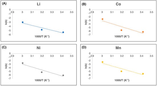 Arrhenius plot for Li (A), Co (B), Ni (C), and Mn (D).