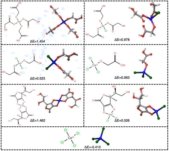 To identify the complexes that Co can potentially form following the leaching process, the bond energies between Co and various ligands were calculated. The complexes that Co can form and their bond energies are given in Figure 10. The presence of Co in tetrahedral form in DES solutions has been reported in another study [53]. The tetrahedral Co-glycolate (ΔE = 1.454 Hartree) complex exhibits a lower bonding energy compared to the corresponding Co-ascorbate (ΔE = 1.462 Hartree) complex. Following the leaching process, Co appears to exhibit a higher affinity for complexation with GLY rather than AA in the ternary DES system. The introduction of Cl− anions into the tetrahedral coordination led to a further decrease in the bonding energies of the Co-ascorbate and Co-glycolate complexes, respectively. The [CoCl4]2− complex, representing the complete occupation of tetrahedral coordination sites by Cl− anions, exhibits the lowest bonding energy difference (ΔE = −0.413 Hartree). Based on the calculated bond energies, it is inferred that Co preferentially forms the [CoCl4]2− complex with chloride anions rather than coordinating with AA or GLY. Comparable findings were reported in a separate study employing a similar methodological approach [53].