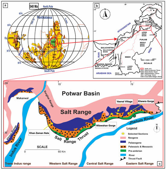 The paleogeographic and present-day location of the Salt Range, Pakistan. (a) A paleogeographic reconstruction of the Indian Plate and the Salt Range during the Early Cambrian period; (b) a structural map of Pakistan highlighting the position of the Salt Range; and (c) a geological map of the Salt Range indicating the locations of the studied stratigraphic sections (yellow stars) [11,15,26].
